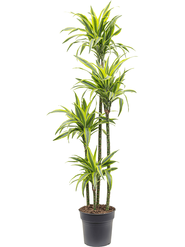 De Dracaena (Drakenbloedboom) staat op de NASA-lijst van luchtzuiverende planten. Elegante langwerpige bladeren. Zeer weinig water nodig. Perfect voor halfschaduw.