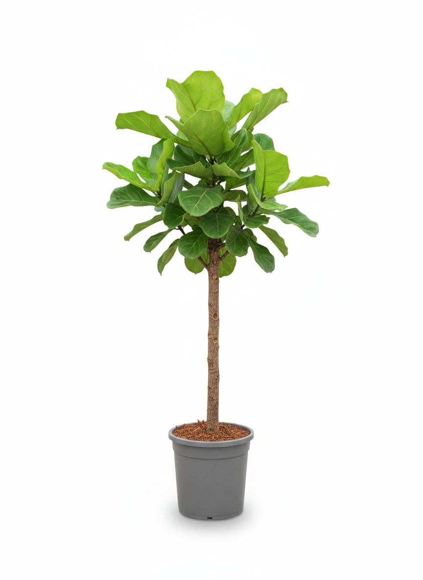 De Ficus lyrata is een indrukwekkende kamerplant met grote, glanzende bladeren die direct sfeer brengt in woonkamer, kantoor of ontvangstruimte. Met een hoogte van 145 cm vormt deze plant een stijlvolle blikvanger voor grotere ruimtes en draagt hij bij aan een frissere binnenlucht dankzij zijn sterke luchtzuiverende eigenschappen. Let op: de plant is licht giftig voor huisdieren, plaats hem buiten bereik.