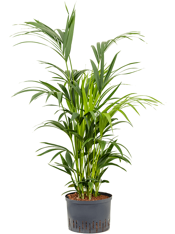 De Kentiapalm (Howea forsteriana) is een populaire kamerpalm met sierlijke overhangende veren. Luchtzuiverend en huisdiervriendelijk.