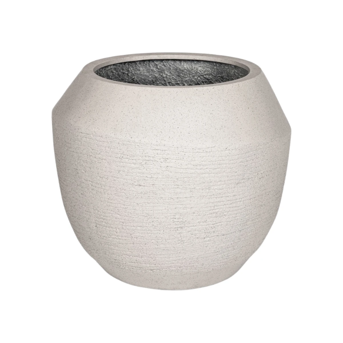 Gemaakt van onderhoudsarm kunststof met een matte, korrelige afwerking in zandgrijs. De pot is rond met een subtiel afgeronde rand en stabiele vlakke bodem. Dankzij het materiaal is hij licht van gewicht en tegelijk stevig. Past perfect in moderne, Scandinavische en industriële interieurs en vormt een rustige basis voor grote bladplanten.